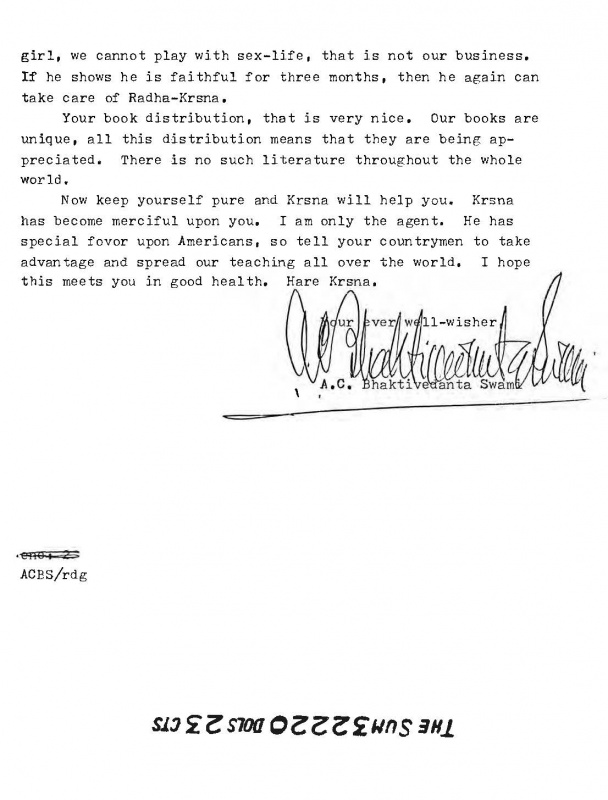 Ahora mantente puro y Krsna te ayudará. Krsna ha sido misericordioso contigo; yo solo soy el instrumento. Él tiene un favor especial hacia los estadounidenses, así que dile a tus compatriotas que aprovechen esto y difundan nuestras enseñanzas por todo el mundo. Espero que la presente te encuentre con buena salud. Hare Krsna.