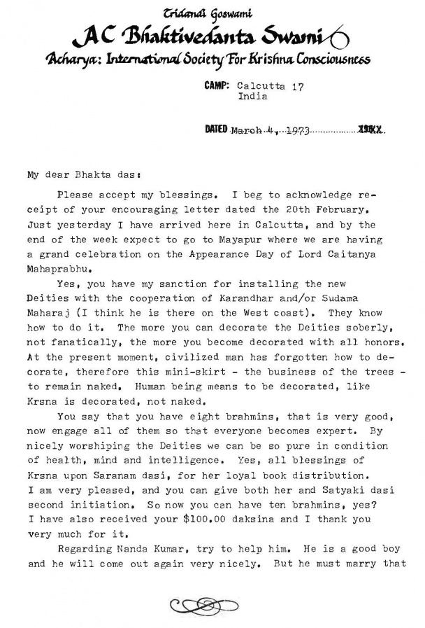 Sí, tienes mi autorización para instalar a las nuevas Deidades con la cooperación de Karandhar y/o Sudama Maharaj (creo que él está en la costa oeste). Ellos saben cómo hacerlo. Mientras más puedas decorar a las Deidades de manera sobria, no fanáticamente, más tú mismo te verás adornado con todos los honores. En lla actualidad, el hombre civilizado ha olvidado cómo decorar, y por eso existe la minifalda —el asunto de los árboles— quedarse desnudos. El ser humano debe estar decorado, como Krsna está decorado, no desnudo.