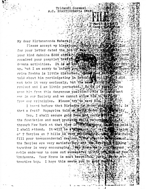 Por favor, acepta mis bendiciones. He recibido debidamente tu carta fechada el 3 de marzo de 1973 junto con tu amable cheque de daksina por $200. Muchas gracias, he recibido tu folleto invitando a participar en las actividades de New Vrindavana. Es un folleto excelente, muy bien presentado, pero lamento informarte que tu cofundador Hayagriva Prabhu está un poco perturbado.