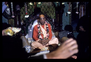 A Legfelsőbb Úrral kapcsolatba kerülni tehát egyáltalán nem nehéz (''ko ’ti-prayāsaḥ''). Ám ahhoz, hogy valaki a pokolba kerüljön, nagy erőfeszítésre van szükség. Ha valaki a tiltott nemi élettel, a húsevéssel, a szerencsejátékkal, az alkohol- és kábítószer élvezettel a pokolba akar jutni, nagyon sok mindenre van szüksége. A tiltott nemi élethez pénz kell, hogy bordélyházba járhasson, a húsevéshez számtalan vágóhídra van szükség, a szerencsejátékhoz kaszinók és szállodák kellenek, ha pedig részegeskedni akar, sörfőzdéket kell nyitnia. Ha tehát valaki a pokolba kíván menni, az rendkívüli igyekezetet kíván, ha azonban haza akar térni, vissza Istenhez, ehhez nincs szükség nagy erőfeszítésre. Ahhoz, hogy valaki visszamenjen Istenhez, élhet egyedül, bárhol, bármilyen körülmények között, s elegendő, ha csak nyugodtan leül, és a Felsőlelken meditál, s közben az Úrról énekel és Róla hall. Az Urat tehát nem nehéz megközelíteni. ''Adānta-gobhir viśatāṁ tamisram''. Amiatt, hogy az ember képtelen uralkodni az érzékein, rendkívül sokat kell küzdenie, hogy a pokolba mehessen. Ha azonban józan, nagyon könnyen elnyerheti az Istenség Legfelsőbb Személyisége kegyét, mert az Úr mindig ott van vele. Ha valaki a ''śravaṇaṁ kīrtanaṁ viṣṇoḥ'' egyszerű folyamatát végzi, az Úr elégedetté válik, sőt azt mondja: | A Legfelsőbb Úrral kapcsolatba kerülni tehát egyáltalán nem nehéz (''ko ’ti-prayāsaḥ''). Ám ahhoz, hogy valaki a pokolba kerüljön, nagy erőfeszítésre van szükség. Ha valaki a tiltott nemi élettel, a húsevéssel, a szerencsejátékkal, az alkohol- és kábítószer élvezettel a pokolba akar jutni, nagyon sok mindenre van szüksége. A tiltott nemi élethez pénz kell, hogy bordélyházba járhasson, a húsevéshez számtalan vágóhídra van szükség, a szerencsejátékhoz kaszinók és szállodák kellenek, ha pedig részegeskedni akar, sörfőzdéket kell nyitnia. Ha tehát valaki a pokolba kíván menni, az rendkívüli igyekezetet kíván, ha azonban haza akar térni, vissza Istenhez, ehhez nincs szükség nagy erőfeszítésre. Ahhoz, hogy valaki visszamenjen Istenhez, élhet egyedül, bárhol, bármilyen körülmények között, s elegendő, ha csak nyugodtan leül, és a Felsőlelken meditál, s közben az Úrról énekel és Róla hall. Az Urat tehát nem nehéz megközelíteni. ''Adānta-gobhir viśatāṁ tamisram'' ([[HU/SB 7.5.30|SB 7.5.30]]). Amiatt, hogy az ember képtelen uralkodni az érzékein, rendkívül sokat kell küzdenie, hogy a pokolba mehessen. Ha azonban józan, nagyon könnyen elnyerheti az Istenség Legfelsőbb Személyisége kegyét, mert az Úr mindig ott van vele. Ha valaki a ''śravaṇaṁ kīrtanaṁ viṣṇoḥ'' ([[HU/SB 7.5.23-24|SB 7.5.23]]) egyszerű folyamatát végzi, az Úr elégedetté válik, sőt azt mondja: | ||