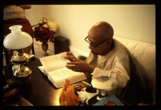 A nagy bölcsek, a nagy bhakták teljes energiájukat és valamennyi tettüket az Úr lótuszlábának szolgálatába állítják, ezért hát lennie kell valamilyen transzcendentális élvezetnek az Úr lótuszlábának ujjaiban. Az Úr azért   | A nagy bölcsek, a nagy bhakták teljes energiájukat és valamennyi tettüket az Úr lótuszlábának szolgálatába állítják, ezért hát lennie kell valamilyen transzcendentális élvezetnek az Úr lótuszlábának ujjaiban. Az Úr azért nyalogatja a lábujjait, hogy megízlelje azt a nektárt, melyre a bhakták örökké vágynak. Néha Maga az Istenség Legfelsőbb Személyisége is azon tűnődik, mennyi transzcendentális gyönyör lehet Benne, s hogy megízlelje saját potenciáját, olyan helyzetet teremt, ahol megízlelheti saját Magát. Az Úr Caitanya Maga Kṛṣṇa, de bhaktaként jelenik meg, hogy megérezhesse a Benne lévő transzcendentális íz édességét, melyet Śrīmatī Rādhārāṇī érez, aki valamennyi bhakta között a legkiválóbb.  | ||