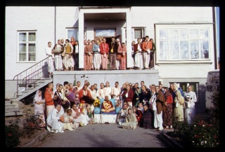 bibhrat veṇum—a fuvolát ott tartva; jaṭhara-paṭayoḥ—a feszes ruha és a hasa között; śṛṅga-vetre—a bivalykürtöt és a tehénhajtó botot egyaránt; ca—szintén; kakṣe—a derékon; vāme—a bal oldalon; pāṇau—kézbe véve; masṛṇa-kavalam—nagyon finom rizsből és a legkiválóbb túróból készült étel; tat-phalāni—hozzáillő gyümölcsdarabok, például bael gyümölcs; aṅgulīṣu—az ujjak között; tiṣṭhan—így maradt; madhye—középen; sva-pari-suhṛdaḥ—saját bensőséges társai; hāsayan—megnevettetve őket; narmabhiḥ—tréfás szavakkal; svaiḥ—sajátja; svarge loke miṣati—miközben a mennyei bolygók, Svargaloka lakói nézték a csodálatos jelenetet; bubhuje—Kṛṣṇa élvezte; yajña-bhuk bāla-keliḥ—noha Ő a yajña során fogad el felajánlásokat, gyermekkori kedvteléseinek kedvéért barátai, a tehénpásztorfiúk körében nagy örömmel és élvezettel kóstolgatta az ételeket.