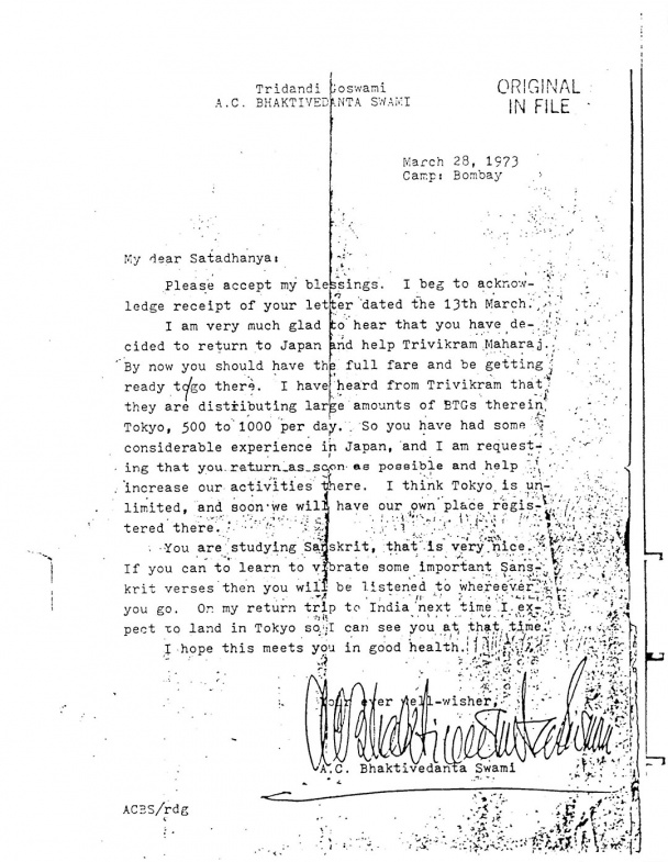 Me complace mucho saber que has decidido regresar a Japón y ayudar a Trivikram Maharaj. Para este momento ya deberías tener el pasaje completo y estar preparándote para ir. He escuchado de Trivikram que están distribuyendo grandes cantidades de Back to Godhead (BTG) en Tokio, entre 500 y 1000 por día. Así que, como ya tienes una experiencia considerable en Japón, te estoy pidiendo que regreses lo antes posible y ayudes a incrementar nuestras actividades allí. Pienso que Tokio es ilimitado, y pronto tendremos nuestro propio lugar registrado allá.