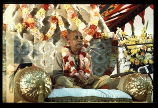 «El Señor Nṛsiṁhadeva recibe siempre el servicio de Sarasvatī, la diosa de la erudición, y abraza constantemente contra Su pecho a la diosa de la fortuna. El Señor goza siempre de conocimiento completo dentro de Sí mismo. Ofrezcamos reverencias a Nṛsiṁhadeva».
