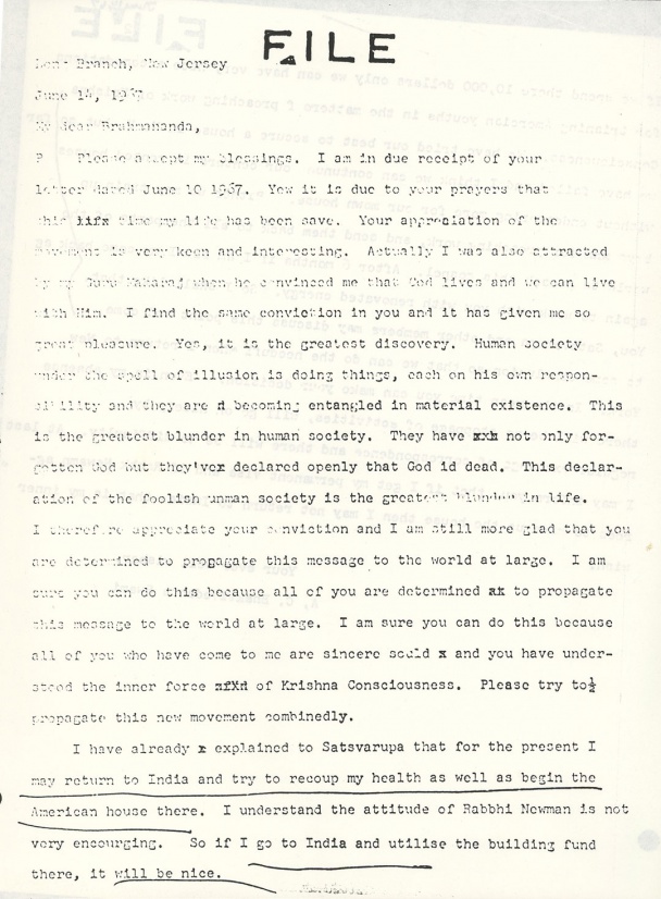 Ya le he explicado a Satsvarupa que por el momento puedo regresar a la India y tratar de recuperar mi salud, así como comenzar allí la casa americana. Entiendo que la actitud de Rabbhi Newman no es muy alentadora. Así que si voy a la India y utilizo el fondo de construcción de allí, sería bueno.