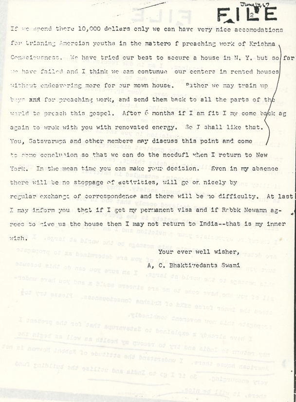 Si gastamos allí sólo 10.000 dólares podemos tener un alojamiento muy bueno para entrenar a los jóvenes americanos en materia de prédica de la Conciencia de Krishna. Hemos hecho todo lo posible para conseguir una casa en Nueva York, pero hasta ahora hemos fracasado y creo que podemos continuar nuestros centros en casas alquiladas sin esforzarnos más por tener nuestra propia casa. Mas bien podemos entrenar muchachos para el trabajo de prédica, y enviarlos a todas las partes del mundo a predicar este evangelio. Después de 6 meses, si estoy en forma, volveré a trabajar con ustedes con energías renovadas. Así lo haré. Tú, Satsvarupa y otros miembros pueden discutir este punto y llegar a alguna conclusión para que podamos hacer lo necesario cuando regrese a Nueva York. Mientras tanto, pueden tomar su decisión. Incluso en mi ausencia, no se detendrán las actividades, se mantendrá un intercambio regular de correspondencia y no habrá ninguna dificultad. Por último, puedo informarte de que si obtengo mi visado permanente y si el rabino Newman accede a darnos la casa, puede que no regrese a la India, ese es mi deseo interior.