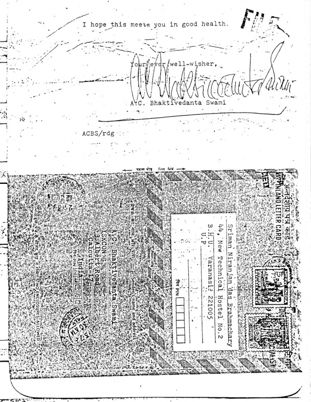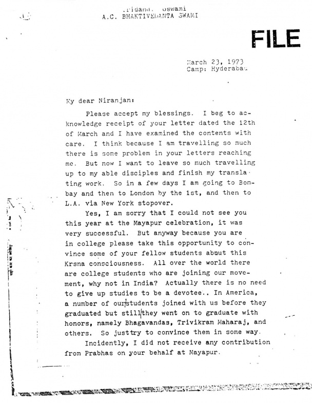 Por favor, acepta mis bendiciones. He recibido debidamente tu carta fechada el 12 de marzo y he examinado cuidadosamente su contenido. Creo que debido a que viajo tanto, hay algún problema para que tus cartas me lleguen. Pero ahora quiero dejar tanto viaje en manos de mis capaces discípulos y terminar mi trabajo de traducción. En unos días iré a Bombay, luego a Londres para el día 1, y después a Los Ángeles haciendo escala en Nueva York.