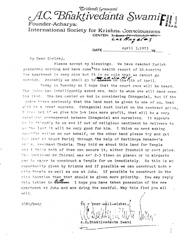 Hoy es martes, espero que el caso en la corte sea escuchado. El juez ha preguntado inteligentemente a la Sra. Nair a quién entregará el terreno. Ella nos ha negado y está considerando a Chhaganlal, pero si el juez toma en serio que el terreno debe ser entregado a uno de nosotros, eso será un gran éxito. Chhaganlal debe insistir en el precio del contrato, 7 lakhs, y si le damos 3 o 4 lakhs más de ganancia, ese será un arreglo excelente entre Chhaganlal y nosotros. Parece que es amistoso con nosotros, y si por sentimiento religioso nos entrega el terreno, será muy bueno para él. Creo que no hay necesidad de pedir ninguna acción específica de nuestra parte; por otro lado, por favor intenten conseguir el terreno en Grand Paridi con la ayuda de Karatikeya Mahadevia o del Sr. Ramchand Chabria. Ellos me hablaron sobre este terreno para el templo y creo que ambos pueden conseguirlo, ya sea en propiedad absoluta o al precio de costo. El caballero Sr. Thirani fue encontrado 2 o 3 veces en aviones o aeropuertos y está deseoso de construir un templo para nosotros de inmediato. Así que esta es una oportunidad dada por Krishna y, si es posible, podemos construir tanto un templo en la ciudad como uno en Juhu. Si es posible construir en la ubicación de la ciudad, entonces esa debe tener más prioridad. Puedes responder esta carta a L.A. [handwritten]. Espero que hayan tomado posesión del nuevo apartamento en Juhu y que estén haciendo lo necesario. Que esta carta los encuentre bien a todos.